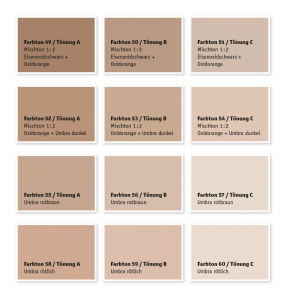 Die Online-Farbkarten dienen ausschließlich der groben Orientierung. Wir möchten darauf hinweisen, dass die Farbtöne durch verschiedene Monitore und deren Einstellungen nicht immer korrekt dargestellt werden können. Gleiches gilt auch für selbst erstellte Ausdrucke dieser Farbkarten. Um einen besseren, bzw. originalgetreuen Eindruck von unseren Farben zu bekommen, empfehlen wir den Erwerb unseres Farbfächers, unserer Farbkarten mit Original-Aufstrichen oder unsere gedruckten, kostenlosen Flyer.