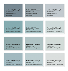 - Aus der passenden Produkttabelle (s.u.) wird das gewählte Mischverhältnis entnommen und mit der gewünschten Menge des Produktes multipliziert. Oder den Farbton in unseremFarbrechner Wandfarben & Putze anwählen und anhand gewünschter Quadratmeterzahlen oder Materialmengen die Mischverhältnisse automatisch berechnen lassen.